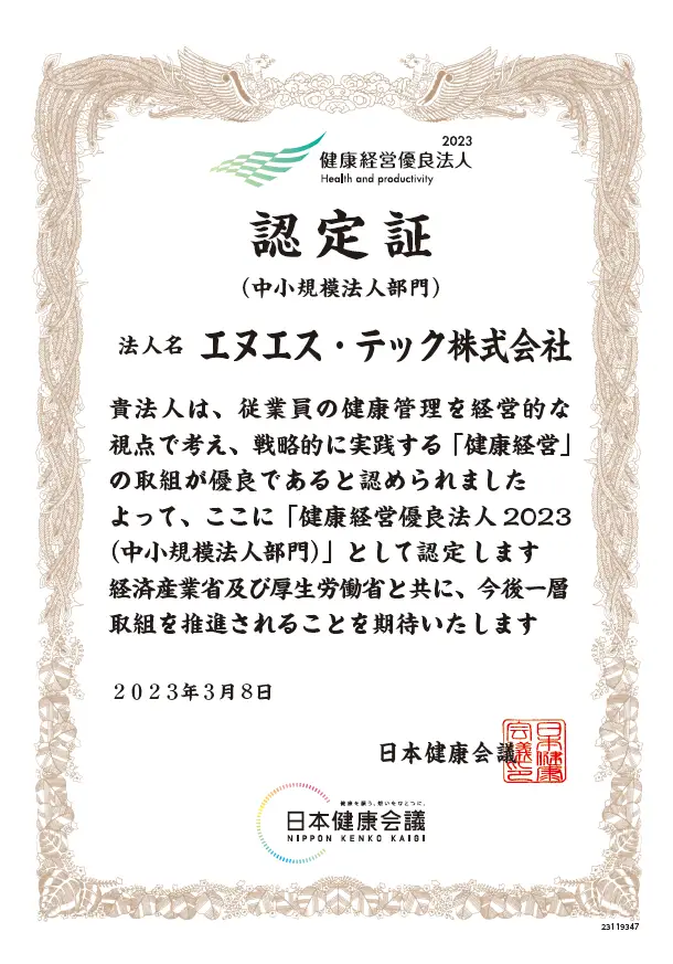 昨年に引き続き、今年も経済産業省 認定制度「健康経営優良法人」に認定されました。認定企業として従業員の健康を経営の柱の一つとし、取り組んでまいります。今後ともエヌエス・テックをよろしくお願いいたします。