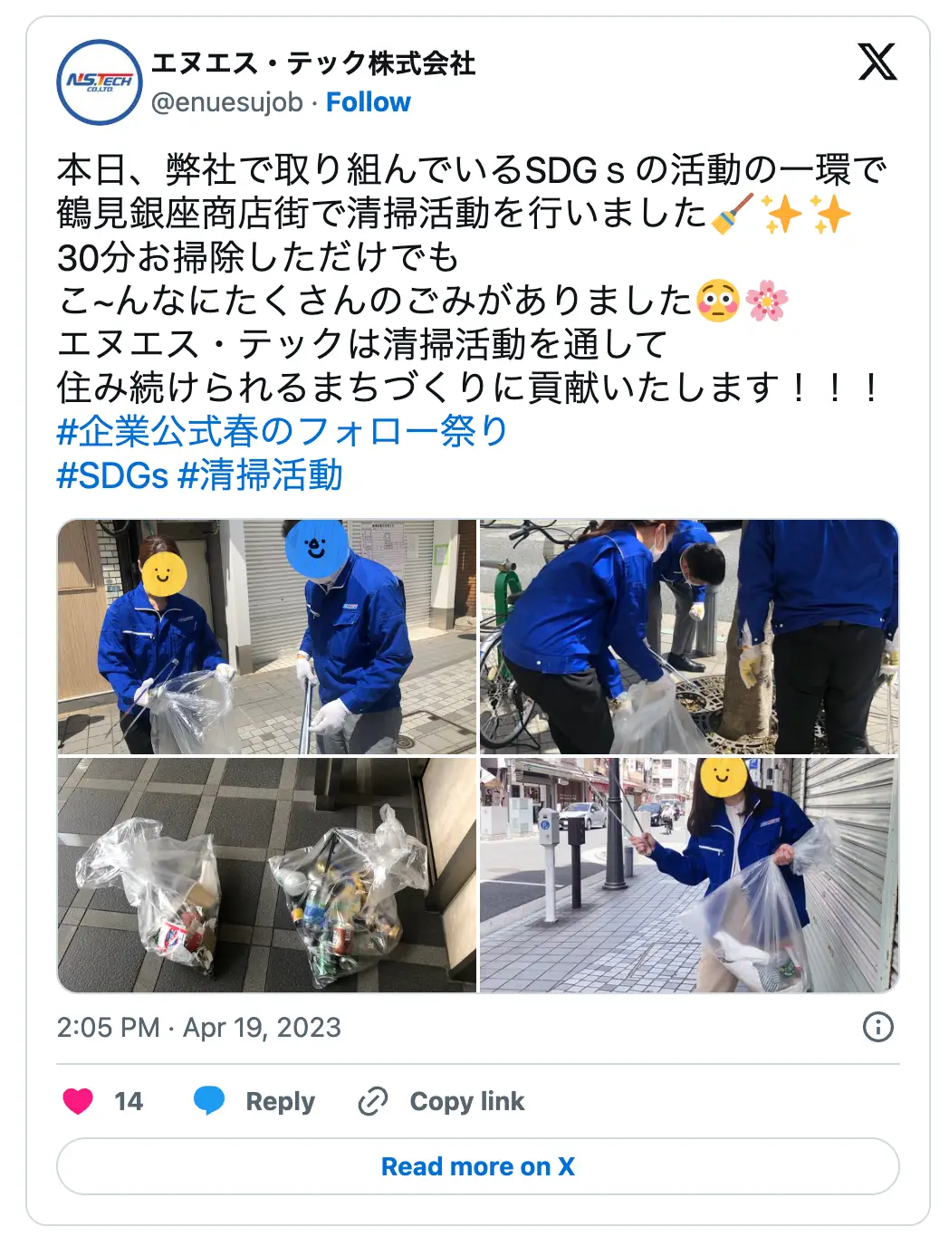 エヌエス・テック株式会社では、CSRの一環として、SDGs(Sustainable Development Goals=持続可能な開発目標)に定められた目標11「住み続けられるまちづくりを」に則り、本社がある鶴見銀座商店街の周辺を中心に定期的に清掃活動を行っています。