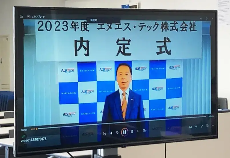 まず初めに取締役社長より祝辞を頂きました。当日は、所用のため参加できず、事前にムービーでお送りいただきました。