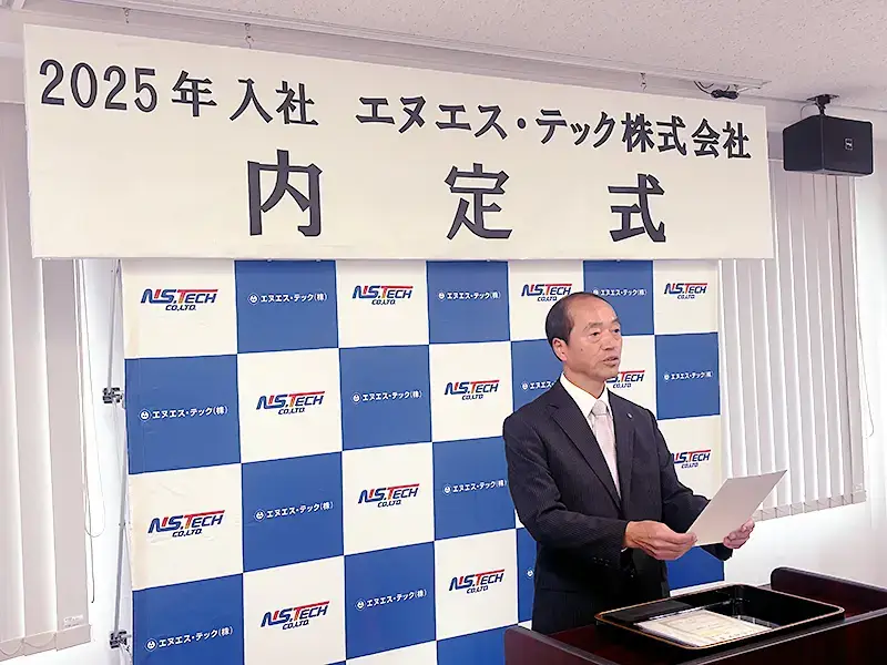 内定式では清水浩二取締役社長の祝辞から始まり、エヌエス・テック株式会社のこれまでの歩みや未来についてのお話し、内定者への思いが伝えられました。